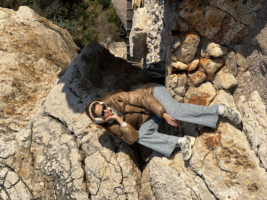 The scene is set outdoors in Perazića Do, Montenegro. A female individual with long brown hair is seated on a low stone wall at the base of a large, fissured rock formation. She is wearing beige ear muffs, green-tinted sunglasses, a white turtleneck, a shiny brown puffer jacket, light blue wide-leg jeans, white socks, and grey and white New Balance sneakers. Her left hand is raised, touching the left ear muff. A dark-colored handbag rests on the stone wall to her right. The immediate environment includes the textured, light-colored rock face and the stone wall, both showing areas of direct sunlight and deep shadow. In the background, to the right, there is a visible area with smaller rocks, piles of aggregate, and wooden planks, indicating a construction site. Further back, green foliage from trees and bushes covers a hillside, with a light-colored stone building partially visible amidst the greenery.