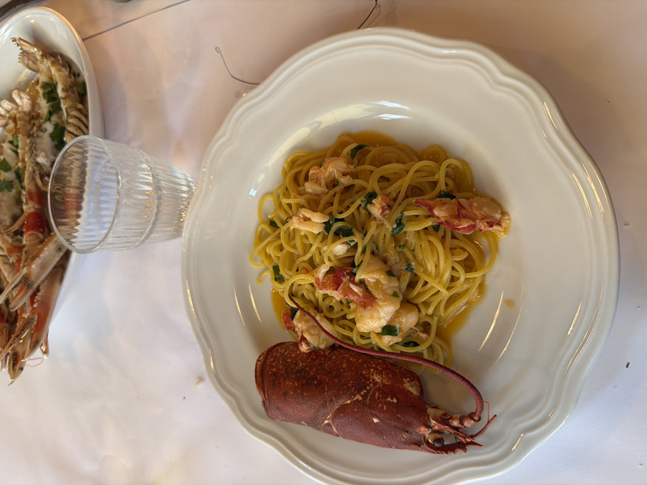 This image depicts a restaurant dining table in Copenhagen, Denmark. The foreground features a white, scalloped-rimmed plate centrally displaying a serving of yellow spaghetti pasta with an orange sauce, mixed with white and red lobster meat pieces and green herbs. A deep red, shelled lobster tail, including its head and a long antenna, is positioned on the left side of the pasta. Behind this plate, a clear, ribbed glass tumbler containing water is present. In the upper background, a white oval serving dish holds several cooked langoustines, garnished with green herbs, appearing slightly out of focus. The table is covered by a plain white tablecloth. No individuals are visible.