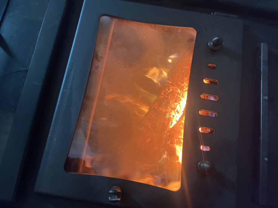An indoor scene in Macedo de Cavaleiros, Portugal, displays a black metal wood-burning stove. The central feature is a large, rectangular glass panel set within the stove's door, through which an active fire is visible. Multiple logs burn with bright orange and yellow flames, illuminating red and orange glowing embers at the bottom of the firebox. The interior surface of the glass exhibits some minor soot or residue accumulation. Below the glass panel, the stove features a horizontal row of five vertical, rectangular air vents, emitting a faint orange glow from within. A dark, round knob, likely a door latch or air control, is present on the left side of the stove, adjacent to the glass and the vents. Another similar knob is partially visible on the far right. The overall environment appears dimly lit, with the fire being the primary light source within the frame. No individuals are present.
