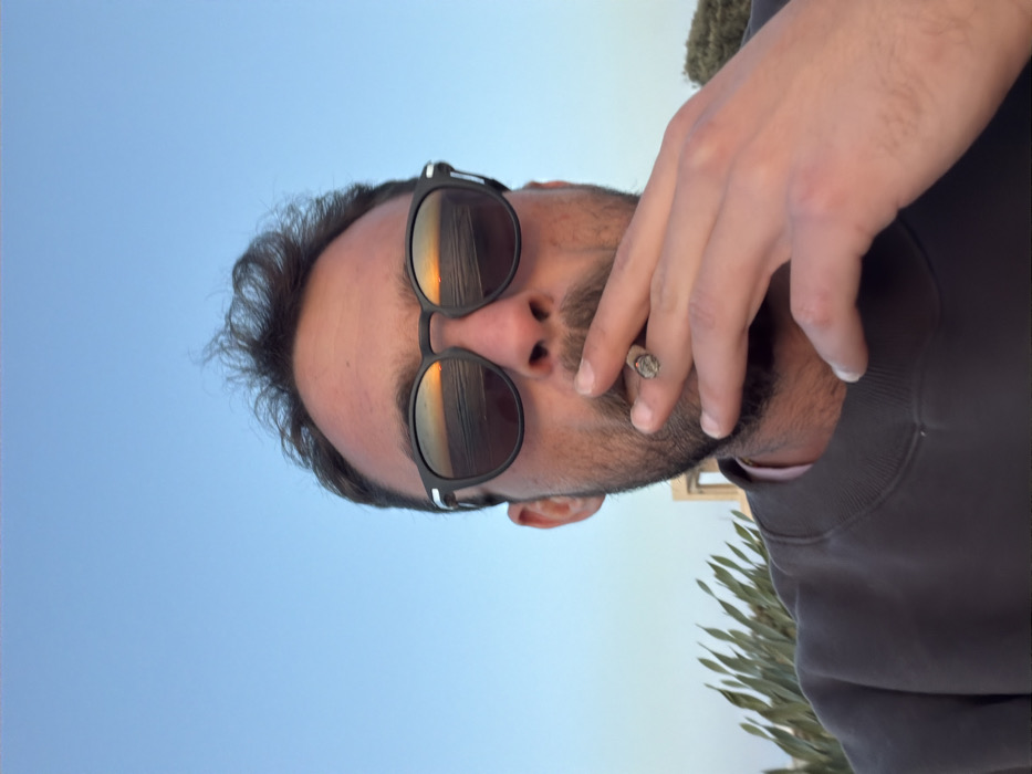 An adult male is depicted in a close-up, slightly low-angle frame, presenting a self-portrait. He possesses dark, short, curly hair, a dark beard, and a mustache. He wears black-framed sunglasses with reflective lenses, which distinctly show a sunset over a body of water, displaying an orange sun low on the horizon and visible waves. The male is dressed in a dark grey crewneck sweatshirt over a light pink collared shirt. His right hand is raised, holding a lit, partially consumed cigarette or cigarillo between his index and middle fingers, positioned near his mouth. The cigarette/cigarillo tip exhibits ash and a glowing ember. The background consists of a clear, light blue sky. To the subject's left, out-of-focus green, spiky foliage is visible. To the right, a light-colored, out-of-focus structure or building is present. The scene occurs at sunset in a coastal environment in the city of Beit Yanai, Israel.