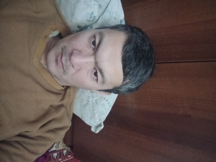 A man lies on a pillow, facing the camera. He has dark hair with some graying and a neutral expression. He wears a tan sweater with a V-neck. The pillow has a light pattern. Behind him is a wooden wall or headboard. A hint of reddish fabric is visible at the bottom left corner.