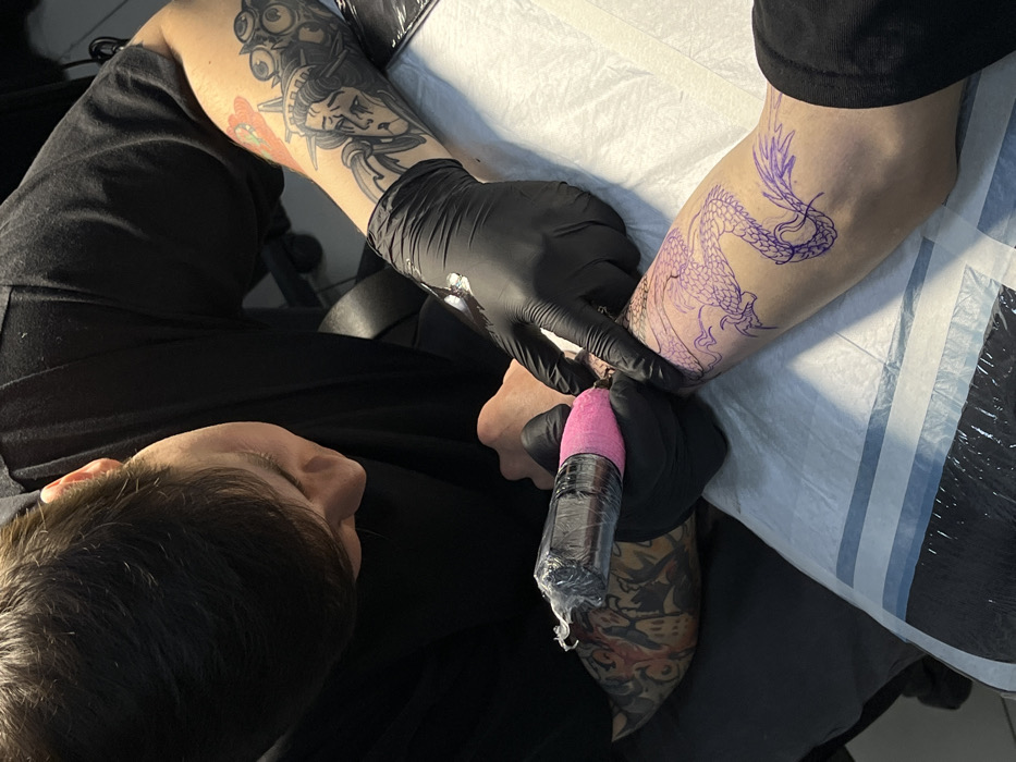 - "A tattoo artist, dressed in a black shirt and black disposable gloves, is positioned overhead, actively tattooing a client's right forearm" by FM-BhCGm1, licensed under CC BY 4.0