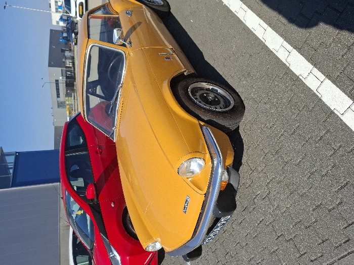 The image displays an outdoor parking lot in Oud Gastel, Netherlands, under a clear blue sky. A yellow Triumph Spitfire hardtop sports car is parked diagonally in the foreground on a dark grey interlocking paver surface. The vehicle exhibits a Dutch license plate "BD-DA-90" on its front, positioned above a chrome bumper fitted with black overriders. Its interior features black seating and a steering wheel. To the left of the yellow vehicle, a red modern compact hatchback is partially visible, also parked, with a yellow air freshener hanging from its rearview mirror. In the background, multiple industrial or commercial buildings are discernible, predominantly grey, with a large structure on the left featuring a distinctive blue section. Other vehicles, including a dark sedan and a white car, are visible further in the distance. White painted lines delineate parking spaces on the paved ground.