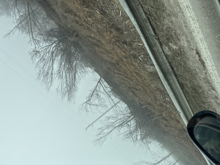 The image depicts a steep, earthen roadside embankment in Kovachevets, Bulgaria, observed under a uniformly overcast and foggy sky. The upper two-thirds of the frame are dominated by a pale grey, hazy atmosphere that significantly reduces visibility. The embankment, composed of brown soil and sparse, dry grass, ascends diagonally from the lower right towards the upper left. Numerous leafless deciduous trees and shrubs with dark, thin branches are rooted or fallen across the slope, their bare forms silhouetted against the mist. A wooden utility pole, supporting multiple overhead power lines, is visible on the middle-left section of the embankment. A two-bar metal guardrail, coated with a thin layer of dust or grime, runs horizontally across the lower foreground, separating the embankment from a partial view of a paved road. Tire tracks and a faint white line are discernible on the road surface below the guardrail. A portion of a vehicle's side mirror is visible in the bottom-left corner, indicating the perspective from inside an automobile. No individuals or active interactions are present in the scene.