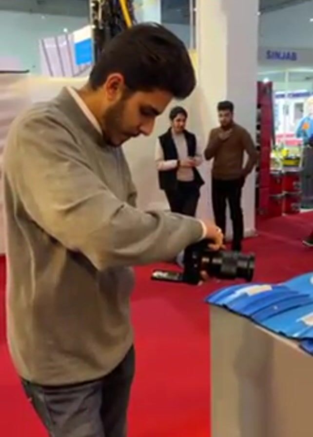 A man in a grey sweater and jeans is focused on operating a camera in an indoor setting with a red carpet. Behind him, several other men are standing and walking. A display table covered with blue packages is in the foreground, beside the man with the camera. In the background, there is a sign that reads "SINJAB".