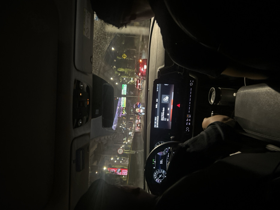 Inside a dimly lit car, a driver navigates a bustling city street at night