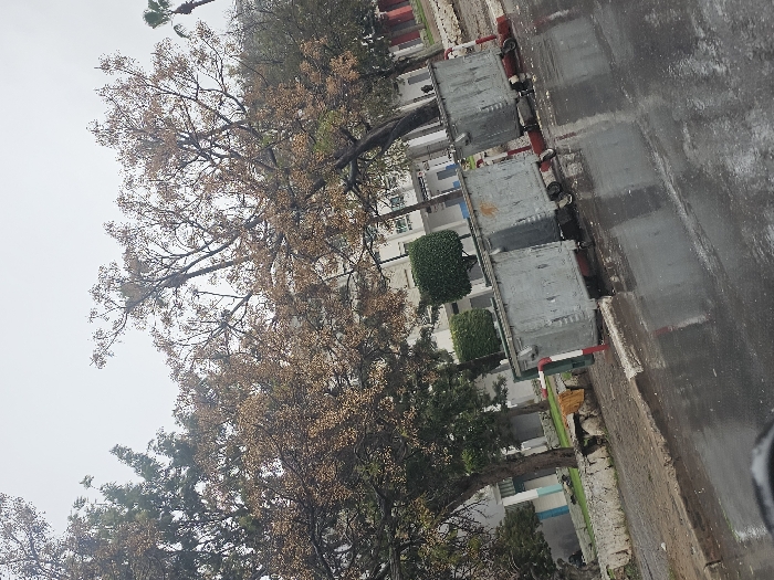 This image displays an outdoor urban environment in Salé, Morocco, under an overcast sky with evidence of recent precipitation. The foreground features a wet asphalt surface reflecting ambient light. In the midground, three large, grey, rectangular waste containers with wheels are positioned alongside a curb. Each container is situated in front of a red and white striped bollard or support. Behind these containers, a low, irregular stone wall delineates a raised ground area where a piece of yellow fabric or material is present. The background consists of several mature trees, some with sparse brown-yellow foliage and others with dense green leaves. Behind the trees and square-shaped trimmed bushes, multiple multi-story buildings are visible. These structures are predominantly light-colored, featuring numerous windows and occasional blue architectural accents. The sky overhead is a uniform light grey, indicating an overcast condition. On the far right, a segment of a palm tree trunk and fronds is discernible against the sky. No identifiable individuals or discernible actions are observed within the frame.