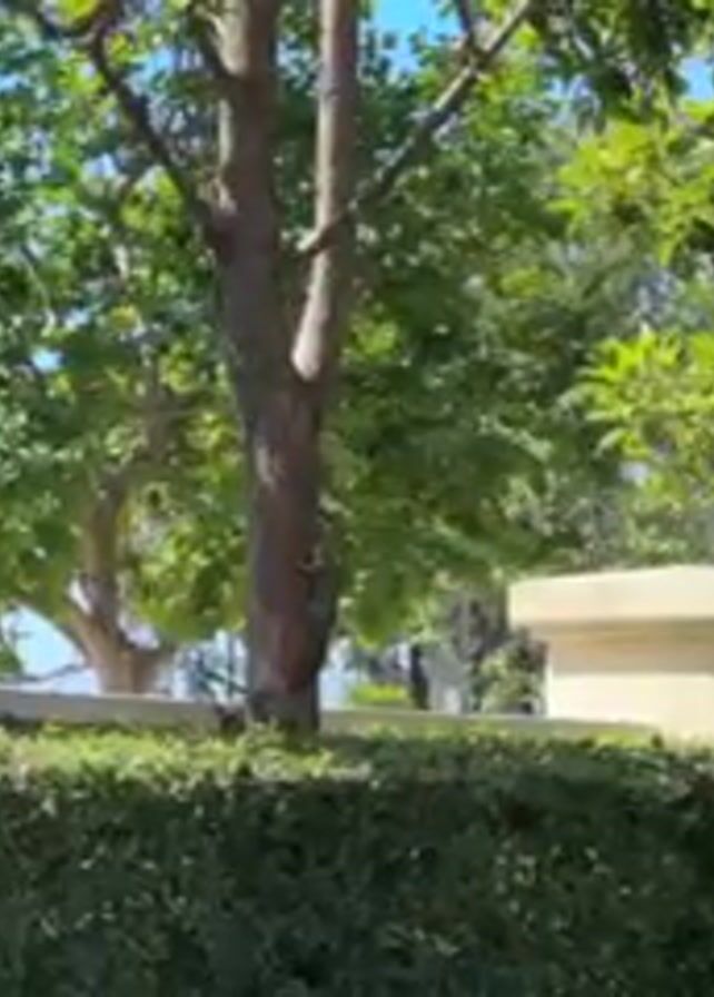 medium shot of a tree in a yard on a sunny day. The tree has a light-brown trunk and green leaves. Behind the tree, there is a low, beige stone wall with a pillar. There is a tall, green hedge in front of the wall. Other trees are visible in the background. A small animal, likely a squirrel, is visible on the tree trunk; it climbs higher into the tree's branches. The sky is blue.