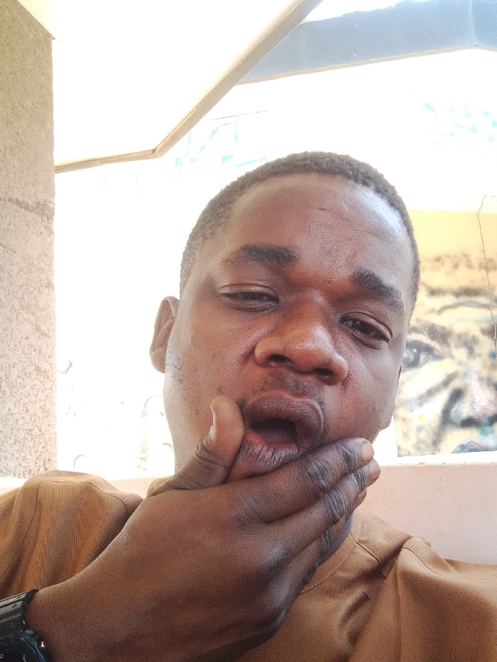 A close-up image depicts a male individual with dark skin, short dark hair, and brown eyes, looking directly at the camera. He is wearing a light brown or tan collared garment, with a dark digital watch visible on his left wrist. His left hand is positioned over his chin and lower mouth, with the fingers obscuring his lower face and the mouth slightly agape. The background consists of a light gray textured wall or pillar on the left, and a brightly illuminated, largely overexposed area on the right, suggesting an outdoor or open space. A faded, abstract painting or mural featuring an eye and part of a face is partially visible in the upper right background. An architectural beam or frame crosses the top of the scene. The location is an unidentified indoor or semi-enclosed space in Unknown, Unknown.