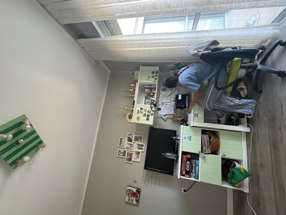 This image depicts an interior residential room located in Rishon LeZion, Israel. A single individual, seen from behind, is seated in a black office chair with a green back and seat, positioned at a white and light-green desk. The person wears a light blue short-sleeved top and grey-and-white striped pajama-style pants, actively operating a silver laptop computer with an external mouse. Bare feet are visible, with a single beige Croc-style slipper on the wooden floor nearby. A dark jacket is draped over the back of the office chair. The room features light grey walls and a wooden floor. A large window on the right side, partially covered by sheer white curtains, reveals an exterior building or balcony. A distinctive green ceiling light fixture, designed to resemble a striped soccer field with four embedded lights and a small white soccer ball, is centered overhead. On the left wall, a framed portrait of Kobe Bryant is displayed, accompanied by handwritten English text on the wall beneath it. A cluster of multiple framed photographs is also mounted on this wall. Adjacent to the desk is a tall, light-green and white shelving unit, decorated with soccer ball motifs. This unit holds a flat-screen television, a dark water bottle, and several board games, including "Scrabble" and one with visible Hebrew text "ג' ו נ ג ל". The lower shelves contain baskets, one holding a folded green fabric item. Above the desk, matching light-green and white wall-mounted shelves display books, several golden trophies, and various small decorative objects. Headphones are suspended from a desk lamp on the workspace. An electrical outlet is visible on the left wall, with cables connected to devices.
