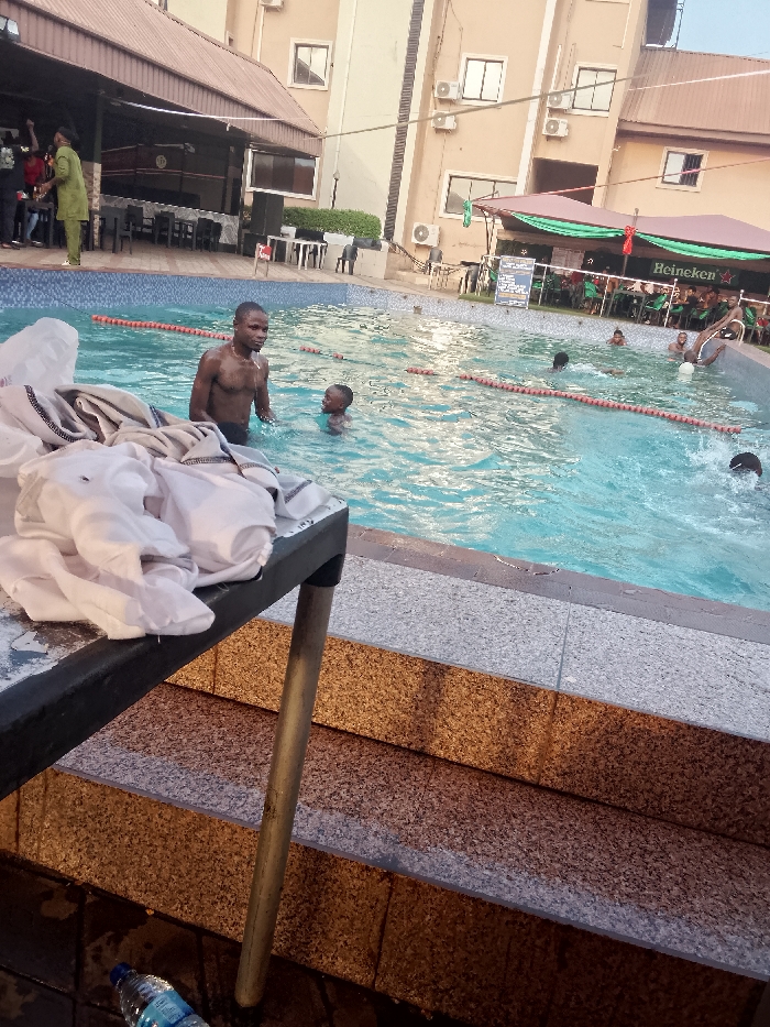 The image depicts an outdoor swimming pool area in Onitsha, Nigeria, under daylight conditions