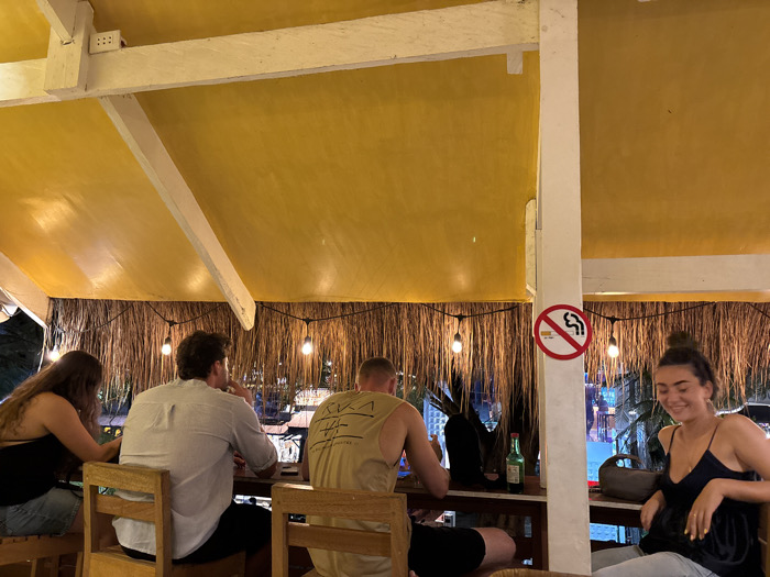 The image depicts an indoor scene within an open-air bar or restaurant located in General Luna, Philippines, during nighttime hours. The establishment features a bright yellow canopy stretched beneath white wooden support beams. Below this, a thatched roof element is present, from which multiple exposed-bulb string lights are suspended, casting a warm glow. Four individuals are seated at a dark wooden bar counter. From left to right: 1. A female, viewed from the back, with long dark hair, wearing a black top and light-colored lower garment, seated on a wooden stool. Her left arm rests on the counter. 2. A male, viewed from the back, with dark, medium-length hair, wearing a light-colored short-sleeved collared shirt, seated on a wooden stool. His right hand is near his chin. 3. A male, viewed from the back, with short, light-colored hair, wearing a tan sleeveless shirt with a dark graphic design, seated on a wooden stool. 4. A female, viewed from the left profile, with dark hair tied in a bun, wearing a dark spaghetti-strap top. She is smiling or laughing, looking towards the left side of the frame. A dark handbag rests on the counter to her right. A green bottle is visible on the counter between the second and third individuals. A red-and-white circular "No Smoking" sign is affixed to a white vertical beam positioned to the right of the third male. The blurred background outside the establishment indicates an urban street scene with various artificial lights. The individuals appear to be engaged in a social setting, likely dining or drinking.