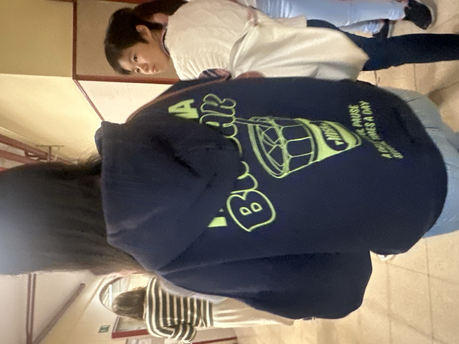 The image depicts an indoor hallway scene in Madrid, Spain. In the foreground, a person with long dark hair is seen from behind, wearing a dark blue hooded sweatshirt. The sweatshirt features a prominent neon green graphic on the back, including the text "BUBBLE BAR" and an illustration of a cup with a straw, containing the word "THIRST." Below the cup, the text "A DAILY PAUSE SEVERAL TIMES A DAY" is visible. This person also wears light-colored denim jeans. To their right, a young person with short dark hair is partially visible, looking towards the camera. This individual wears a light-colored, possibly textured, vest and carries a white tote bag. Further down the hallway on the left, another person is observed from behind, wearing a horizontally striped long-sleeved shirt and light-colored lower garments, walking away from the camera. The hallway features light-colored walls with a darker bottom trim, a reddish-brown pipe or rail along the upper wall, and an arched doorway in the background on the left. A red-on-green fire extinguisher sign is mounted on the wall to the left. The floor appears light-colored.