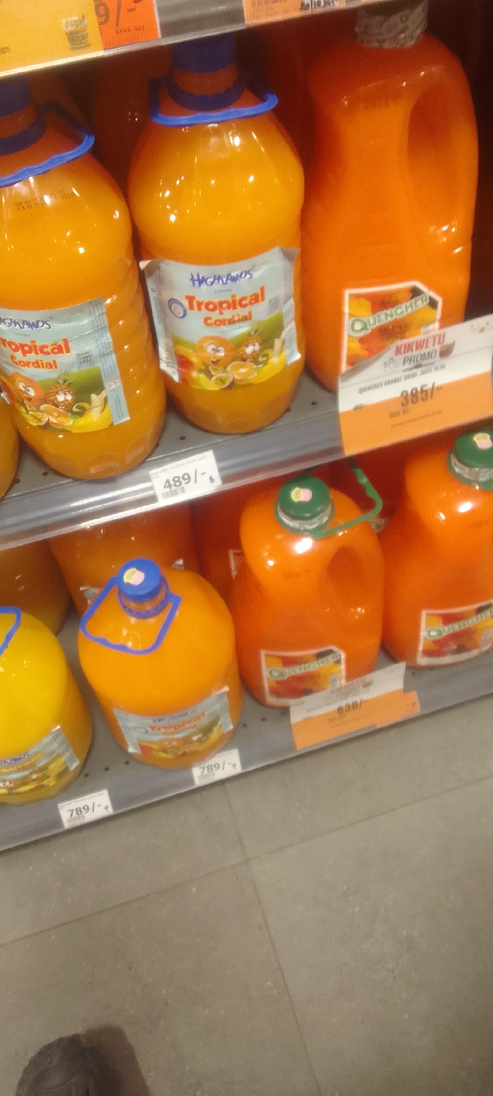 The image displays a retail store aisle within Viwandani ward, Kenya, focusing on two shelves stocked with various large plastic bottles and jugs containing orange-colored beverages. On the upper shelf, multiple "Hagamanos Tropical Cordial" bottles are visible. These bottles are rounded, filled with an orange liquid, and feature blue screw caps with blue plastic ring handles. Each bottle has a light blue label depicting cartoon tropical fruits like pineapple, passion fruit, and orange. A price tag of 489/- is affixed to the shelf beneath one of these bottles. To the right, larger, rectangular jugs of "QUENCHER" orange drink are arranged. These jugs possess integrated handles and a label indicating a "KIKWETU PROMO" with a price of 385/-. The lower shelf similarly displays "Hagamanos Tropical Cordial" bottles, one with a blue cap and handle, priced at 789/-. Adjacent to these are "QUENCHER" jugs, identifiable by their green screw caps and green plastic loop handles, with a price tag of 830/- below one. The shelving units are constructed from light grey metal. The floor beneath the shelves is covered with large, light grey square tiles. A dark-colored shoe or boot, partially visible in the bottom-left corner, indicates the presence of a person standing in the aisle.