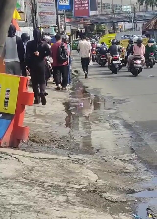 street scene on a sunny day, likely in a city or town. A group of pedestrians, some wearing hijabs, are walking along a cracked, wet sidewalk next to a road with flowing traffic. Several people are riding scooters. Signage in the background suggests a commercial area, with signs advertising businesses and services. There is a puddle of standing water with litter in it.