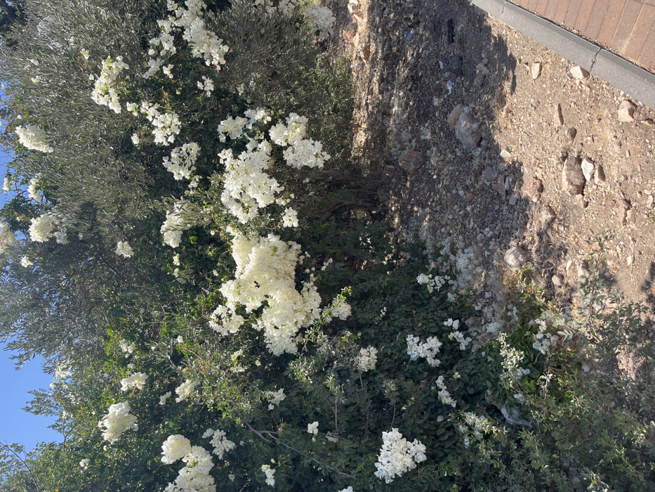 This image displays a sunlit outdoor scene within the Menashe Regional Council, Israel. The central focus is a dense cluster of vegetation comprising a large bush, consistent with white Bougainvillea, profusely covered in white, papery bracts. This flowering plant is intermingled with the foliage of an olive tree, distinguishable by its silvery-green leaves. The ground beneath the vegetation is dry, light brown, stony soil, with numerous scattered white floral debris and small rocks. In the lower right quadrant, a paved edge is visible, constructed from reddish-brown paving bricks bordered by a grey concrete curb, indicating an adjacent pathway or road. The sky in the upper left is clear and blue. No individuals, animals, or active subjects are present.
