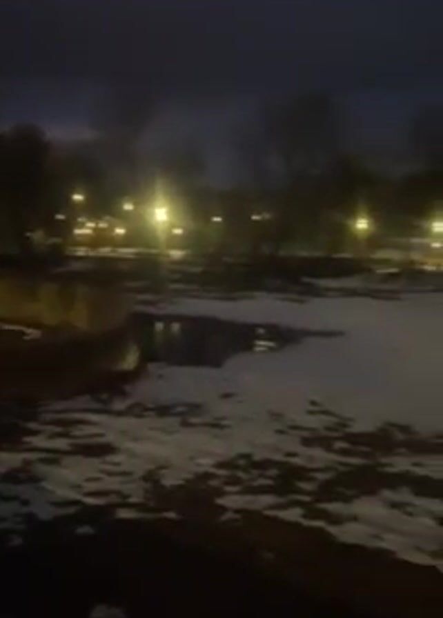 snowy field at night, illuminated by streetlights. The ground is mostly covered with snow, but there are patches of dark earth visible. Some trees without leaves are silhouetted against the dark sky. In the distance, several people are visible, appearing as dark figures moving across the snowy field. The overall scene is dark and somewhat bleak.