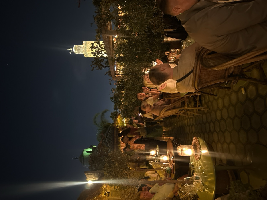 - "The image depicts an outdoor nighttime gathering on a patio or rooftop in Marrakesh, Morocco, with the illuminated minaret of the Koutoubia Mosque visible in the background against a dark sky" by FM-2rkLO2, licensed under CC BY 4.0