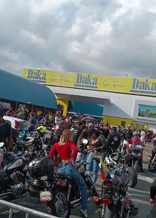 The video depicts a lively gathering of people and motorcycles in a parking lot next to a "Daka Se Feliz" store
