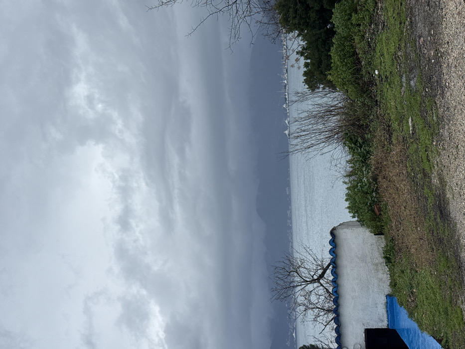 The image displays an outdoor, coastal landscape located in Mrčevac, Montenegro, captured under an overcast sky. The foreground consists of an uneven, unpaved ground surface with patches of green vegetation, dry grass, and exposed dark soil. In the lower-left quadrant, a white wall featuring a blue, scalloped coping along its upper edge is visible. Below this wall, a bright blue surface descends to a dark, rectangular opening, suggesting an entrance or access point. Scattered throughout the mid-ground are leafless tree branches and dense green shrubs. The central portion of the image is occupied by a calm, light blue-grey body of water, indicative of a bay or sea. Across this water, distant mountains or hills, obscured by mist or low clouds, appear dark grey. Along the distant shoreline, a collection of moored boats and yachts, including several large white vessels, is identifiable, suggesting a marina or harbor area. The sky is uniformly covered by a thick layer of grey clouds. No human subjects or specific actions are present in the scene.