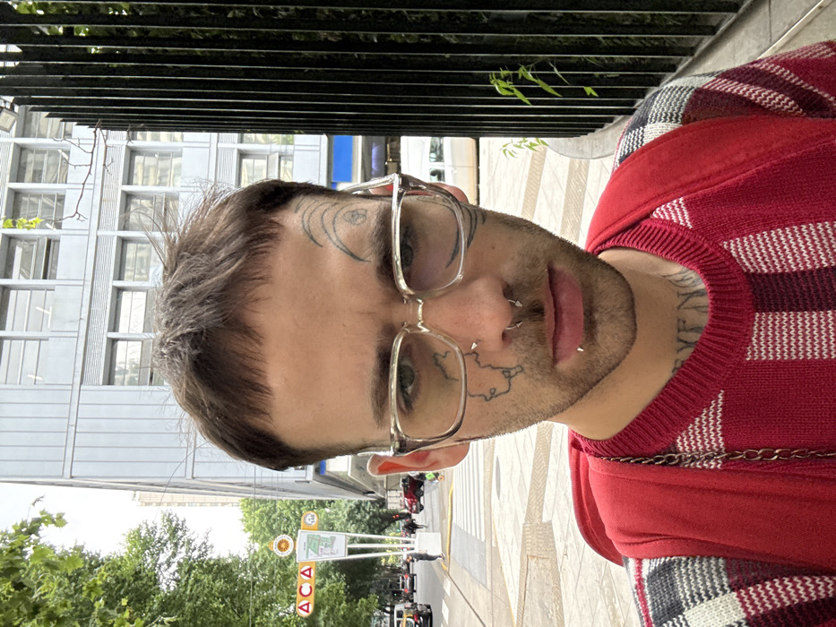 A person with facial tattoos, nose piercings, and clear-framed glasses poses outdoors. They wear a red and white checkered sweater with a red undershirt and a silver chain. A building with many windows is visible in the background, along with trees and street signs, suggesting an urban setting. The image is rotated, causing a slightly disorienting perspective. The person's expression is neutral.