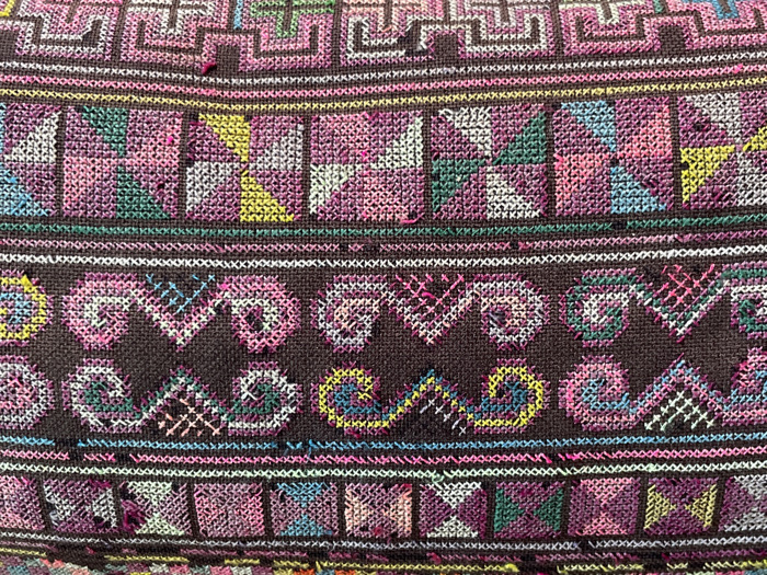 An intricate woven textile displays repeating geometric motifs in horizontal bands