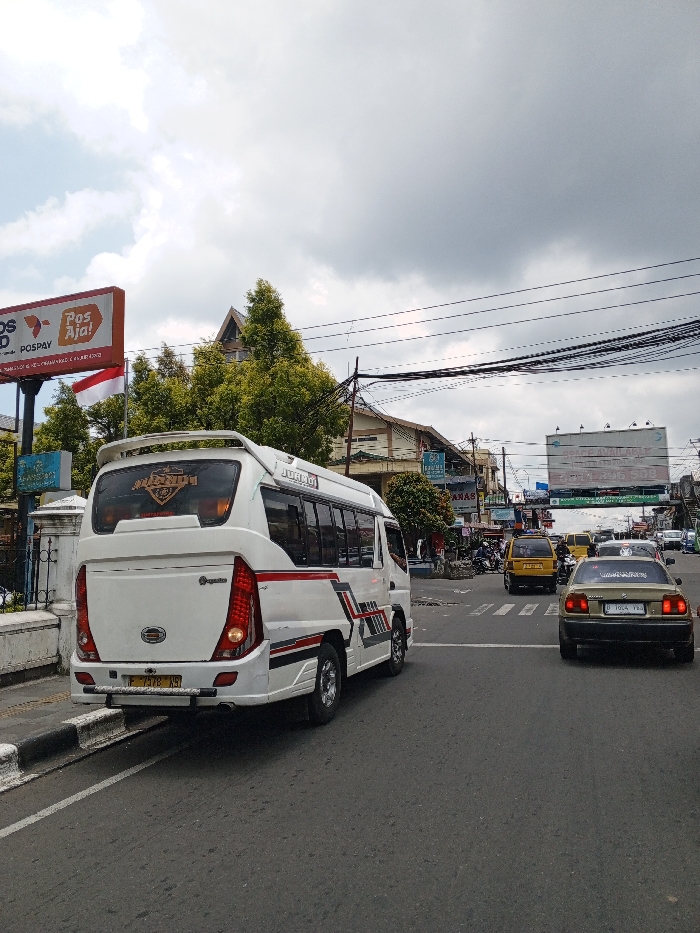 The scene depicts a street view in the city of Multhan, India, under an overcast sky. In the foreground, a white minibus, customized with a rear spoiler and red, black, and grey decals, is angled on the left side of the road, partially on a concrete curb. Its rear license plate, "F 7978 AS," is visible. The rear window displays a decorative brown decal. To the right of the minibus, on the asphalt road, a gold-colored sedan is positioned in a traffic lane, facing away from the viewer, displaying license plate "D 1014 YBS." In the mid-ground and background, additional vehicles, including yellow vans or taxis and motorcycles, are present on the multi-lane road. Buildings line both sides of the street, featuring various architectural styles and visible shop signs. On the left, a large red and orange billboard displays "POS ID," "POSPAY," and "Pos Aja!" alongside a red and white flag, with tall green trees and a building with a dark, pointed roof behind it. Overhead, numerous electrical and telecommunication wires crisscross between utility poles. On the right, another large billboard is visible, featuring text such as "SPACE AVAILABLE." The environment indicates an active urban street with ongoing vehicle movement.