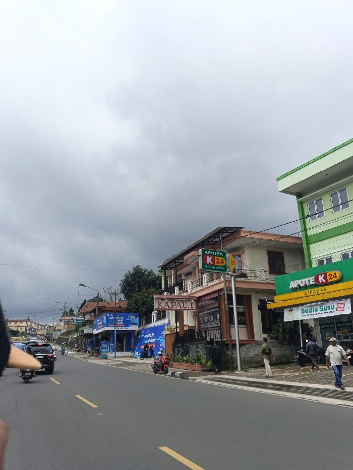 The scene depicts a street in Palayan, Philippines, under an overcast sky. Commercial signage visible, however, identifies "Cipanas." A two-lane asphalt road with a yellow dashed center line extends towards the background. On the right side of the road, a light green multi-story building features a large sign for "APOTEK K 24 CIPANAS," advertising "Sedia Susu" and "24 JAM" service. Adjacent to it stands a light peach multi-story building displaying another "APOTEK K 24" sign and, below it, a "JUTAH MAKAN KAPAU I" restaurant sign. Further down the street, blue-fronted shops exhibit signs for "Jualan XL" and "Internet Cepat." Multiple male pedestrians are observed on the right-side sidewalk, including one in a white t-shirt and blue jeans walking away from the camera. Vehicular traffic on the road includes a black SUV and several scooters/motorbikes, some in motion, others parked. A red scooter is specifically parked on the shoulder near the peach-colored building. Utility poles and overhead power lines are visible along the street. A blurred, dark object partially obscures the immediate foreground on the left.