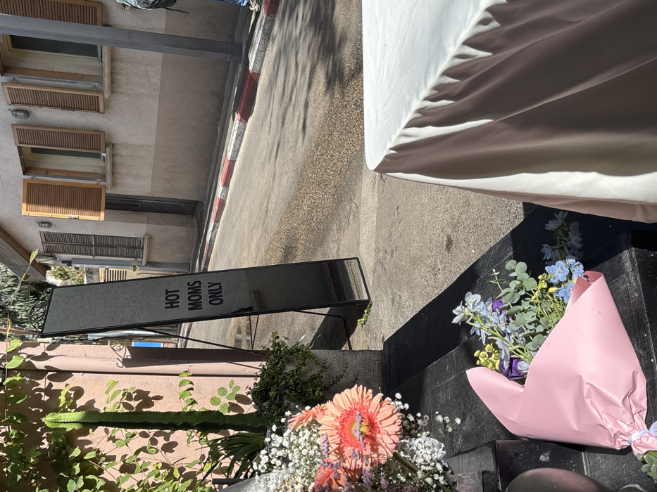 The image captures an outdoor street scene in Tel Aviv-Yafo, Israel, illuminated by bright sunlight creating distinct shadows. In the immediate foreground on the left, a bouquet of blue, purple, and yellow flowers, wrapped in pink paper, rests on a dark, flat surface. Adjacent to this, a floral arrangement featuring prominent orange gerbera daisies and small white flowers is positioned next to a tall, potted columnar cactus and other green foliage against a reddish-brown stucco wall. Centrally located, a tall, rectangular mirror, supported by a black metal stand, stands on the pavement. The mirror's surface prominently displays the white text "HOT MOMS ONLY". Its reflection shows horizontal bands of color. To the right in the foreground, a corner of a table covered with a white tablecloth is partially visible. The mid-ground consists of an asphalt street, bordered by a curb painted with alternating red and white stripes. Across the street, a light-colored, two-story building features multiple windows with open brown wooden shutters and a dark entryway. A grey utility pole is positioned on the far right, partially obscuring the lower torso and legs of a person wearing blue jeans and light-colored sneakers, appearing to walk away from the viewer while carrying a backpack.