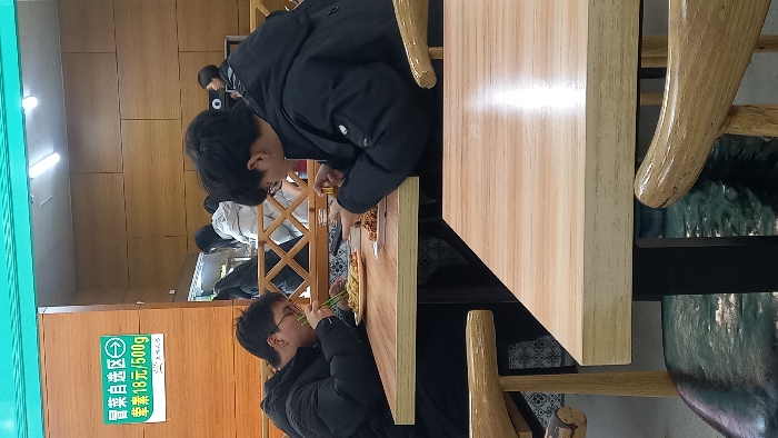 Two people sit at a wooden table in a restaurant, eating. One person wears a black jacket, holding chopsticks, and appears to be eating noodles. The other person, also in a black jacket, uses a phone or device while eating. A sign on the wall indicates the price of vegetables. The setting is casual, possibly a self-service style restaurant, with wooden furniture and bright lighting.
