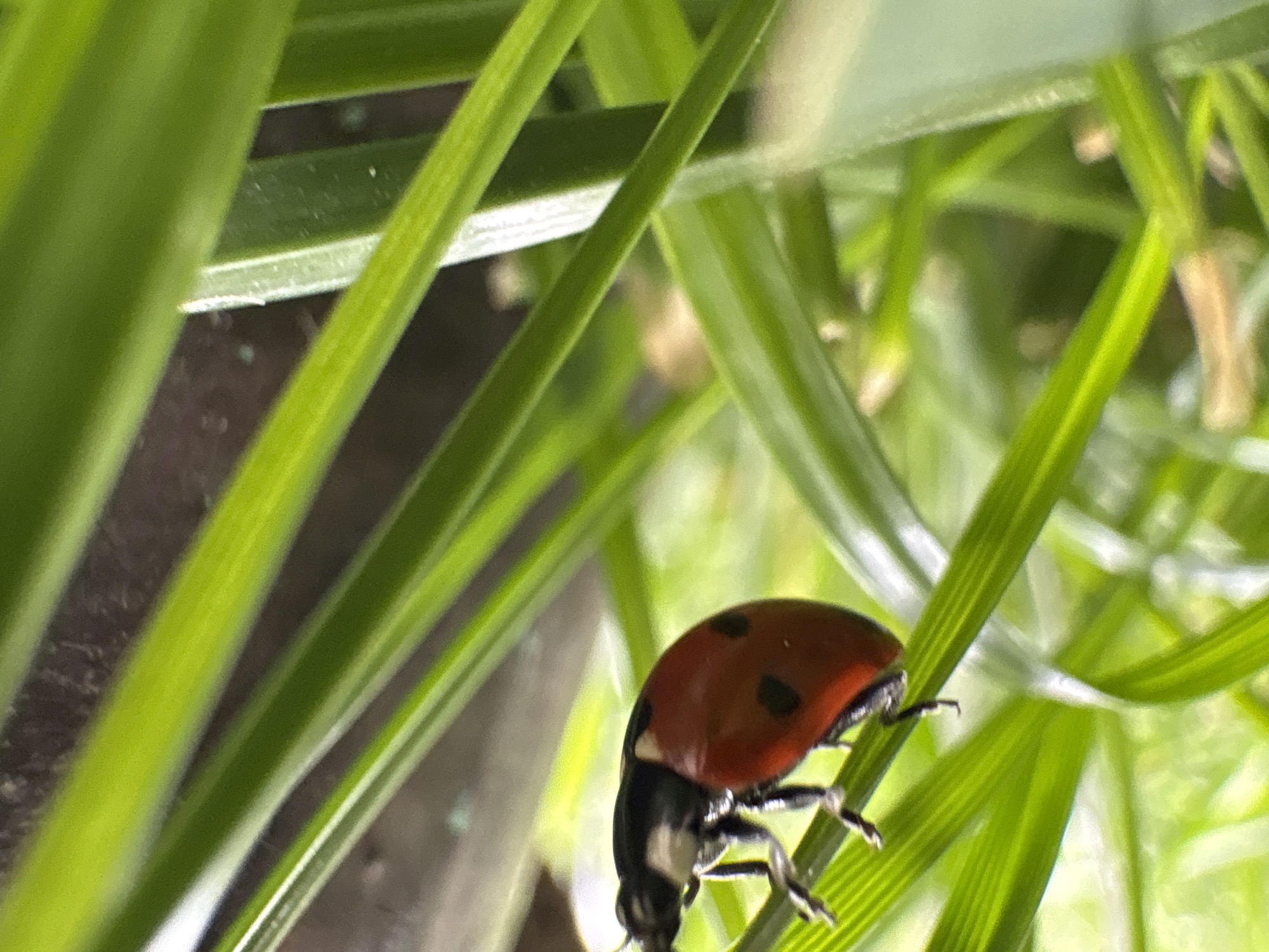 A close-up photograph shows a ladybug perched on blades of green grass. The ladybug is red with black spots, and its black legs are visible. The grass blades are slender and green. A dark brown object is seen behind the grass. The location is Unknown, Unknown.