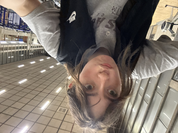 A selfie presents a fair-skinned person with brown hair and green eyes. The individual wears a gray shirt with "TAMU" printed on it, along with a black Nike zip-up jacket. The setting appears to be an indoor venue featuring tiled flooring, rows of stadium-style seating, and metallic walls. The image is rotated, giving a tilted perspective.