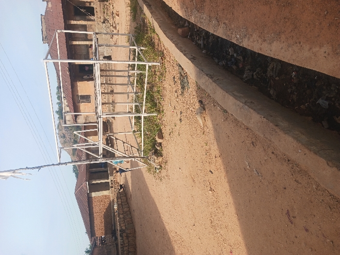 The image displays an outdoor scene in Okengwe, Nigeria. The foreground consists of reddish-brown dirt ground. To the immediate right, a concrete drainage channel, partially filled with dark liquid and refuse, extends into the midground. A prominent two-tiered white metal structure, resembling a play frame or an unfinished construction, stands centrally in the midground, surrounded by sparse green vegetation at its base. Behind this structure, a thin pole with a tattered white fabric strip affixed to its top is visible. Further back, a small child dressed in a light blue garment is observed near a small dark animal, possibly a dog or goat, adjacent to a low stone wall. The background features multiple single-story buildings constructed with reddish-brown mud walls and matching corrugated metal roofs. One building in the center-right background exhibits visible columns and open sections. A rocky hill or outcrop is discernible against a clear, light blue sky in the far background, above which faint utility lines are present. The overall lighting suggests daytime conditions.