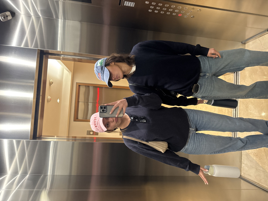 Two individuals are captured in an elevator mirror selfie, likely located in Mexico City, Mexico, a detail inferred from the "MEXICO" embroidery on one person's cap