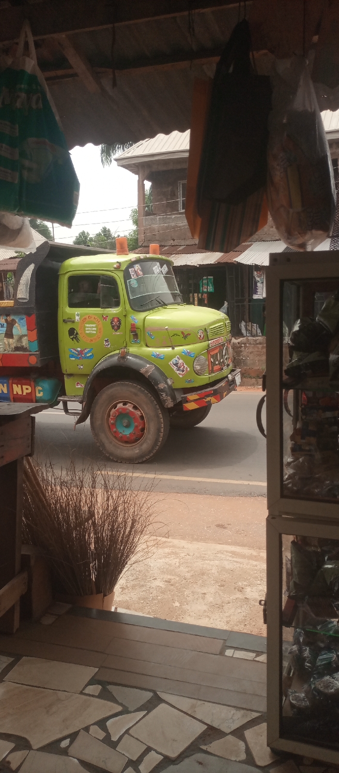 The image presents a street scene in Umuoji, Nigeria, captured from within a shaded structure, likely a shop or market stall. In the immediate foreground, the floor displays a mosaic pattern of irregularly shaped light-colored flagstones with dark grout. A large bundle of dried, broom-like natural fibers stands upright on the floor to the left. The upper part of the frame is dominated by a dark, possibly corrugated metal, roof structure supported by wooden beams, from which several items are suspended, including a green and white striped bag and other patterned bags. To the far right, a vertical section of a white-framed display case containing packaged goods is partially visible. The midground features a paved road on which a lime-green heavy-duty truck is positioned. The truck, identifiable by its Mercedes-Benz cab-over-engine design, features a "TOYOTA" badge on its grille, which also carries a Mercedes-Benz star logo. Its exterior is extensively decorated with various decals including butterflies, skulls, and text such as "TRANSPORT DIVISION" and "NNPC" on the rear section. Two orange beacon lights are mounted on the cab's roof, and the front bumper displays yellow and black diagonal stripes. The visible front wheel hub is painted red and light blue. A human silhouette is discernible through the driver's side window. In the background, across the street, a two-story building constructed of brown block or stone is visible, featuring a white-framed window. To its right, a single-story structure with a corrugated metal roof is present. Scattered trees and vegetation are visible behind and around these buildings. The sky above appears bright and overcast, indicating daytime.