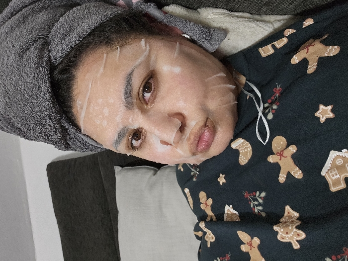 A close-up, slightly high-angle shot depicts an individual, likely female, reclining indoors within a private residence in Nuremberg, Germany. The individual's face is covered by a transparent sheet mask, visible across the forehead, cheeks, nose, and chin, with cutouts for the eyes and mouth. The eyes, with brown irises, are open and directed towards the viewer. The lips are pursed forward. Dark hair is wrapped in a grey terry cloth towel, forming a turban-like shape. The individual wears a dark green or teal long-sleeved garment patterned with light brown gingerbread men, gingerbread houses, stars, and red-berried holly sprigs. The background consists of a dark grey upholstered surface, possibly a sofa or headboard, and a light grey pillow positioned to the left.