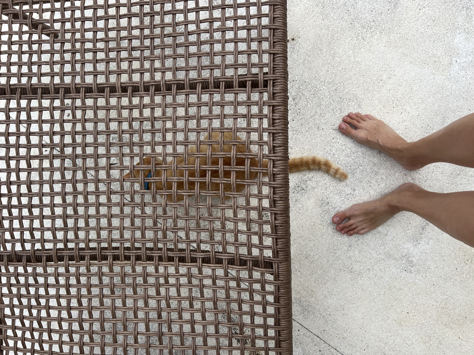 The scene, set in Munggu, Indonesia, is captured from a high-angle perspective. In the foreground, a pair of bare human feet and lower legs are visible on a light-colored, textured ground surface. A brown, tightly woven rattan-style surface, likely the underside of a table or chair, extends horizontally across the mid-ground, partially obscuring the view. Through the weave of this surface, an orange tabby cat is observed sitting on the same light-colored ground. The cat is oriented away from the viewer and wears a light blue collar. Its tail extends downward on the ground, partially visible below the woven surface. No direct interaction between the human and the cat is depicted.
