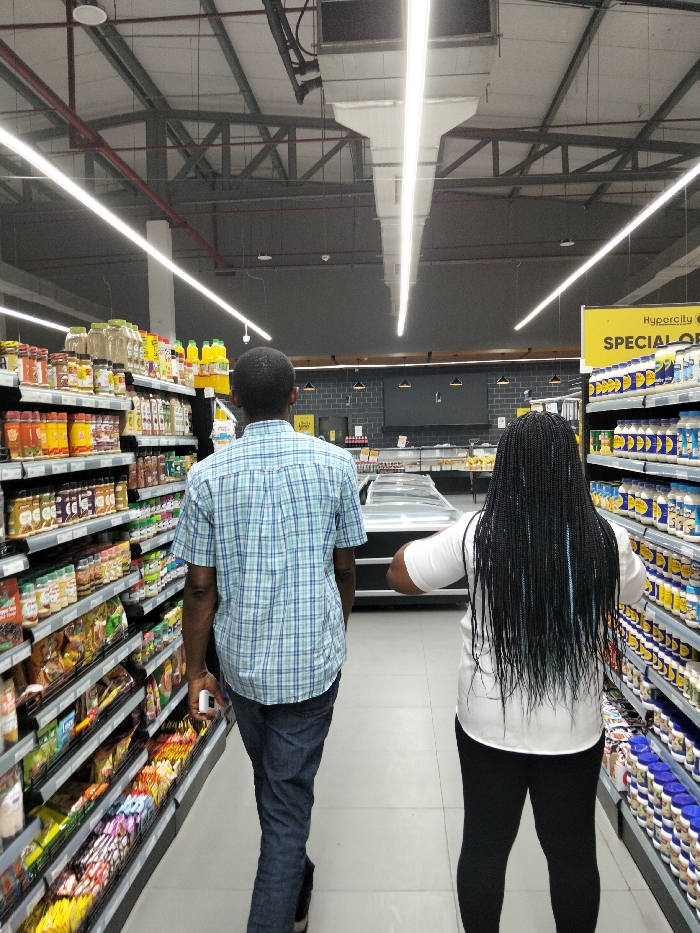 Two individuals walk down an aisle in a grocery store, their backs to the camera. The person on the left wears a blue and white plaid shirt and jeans, holding a white device in their hand. The person on the right has long, dark braids, a white shirt, and black pants. Shelves on both sides are stocked with various food products. Overhead, bright fluorescent lights illuminate the aisle. Above, the high ceiling reveals exposed ductwork and structural supports.