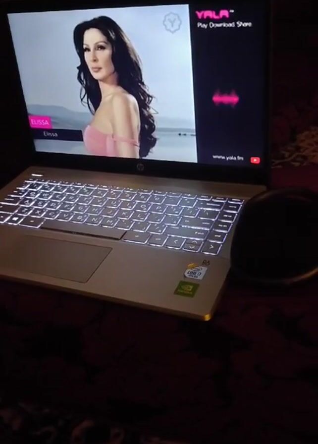 A laptop sits on a bed, playing a video of a woman with long dark hair. The laptop keyboard is backlit with white light. Next to the laptop is a small round object. The room is dark. A song is playing.