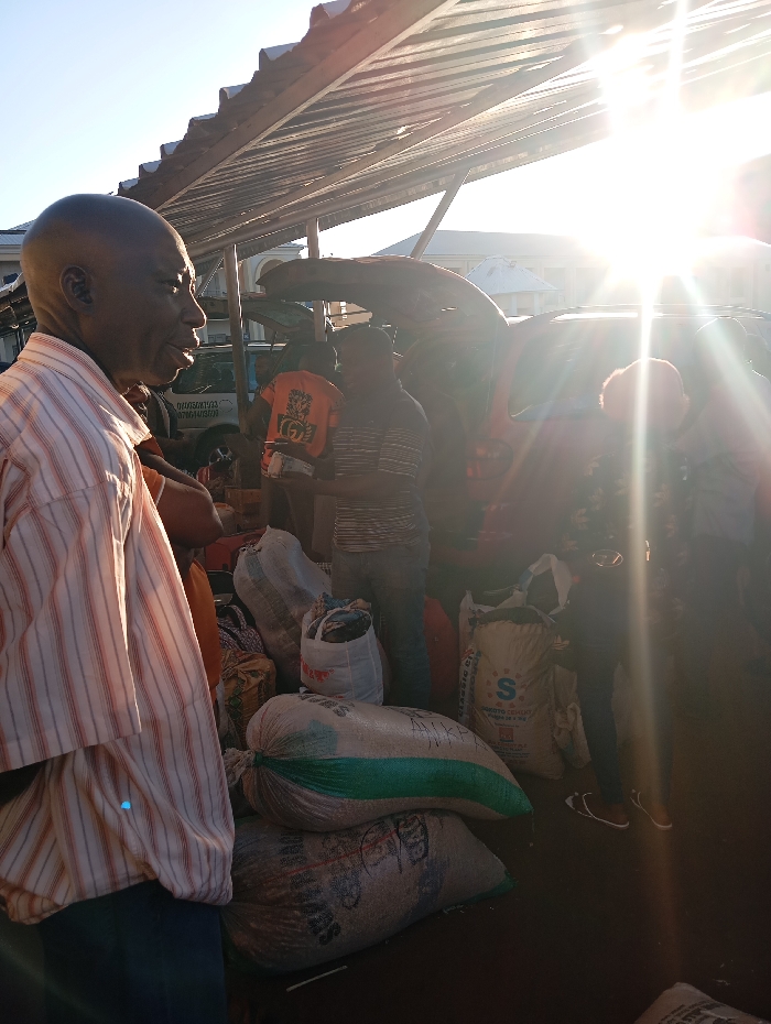Under a metal awning with harsh sunlight, a group of people stands near a red vehicle loaded with large sacks. A man in a striped shirt is in the foreground. Several large sacks with labels are visible, including one marked with a large "S." People are bustling around the vehicle. The scene appears to be a market or loading area.