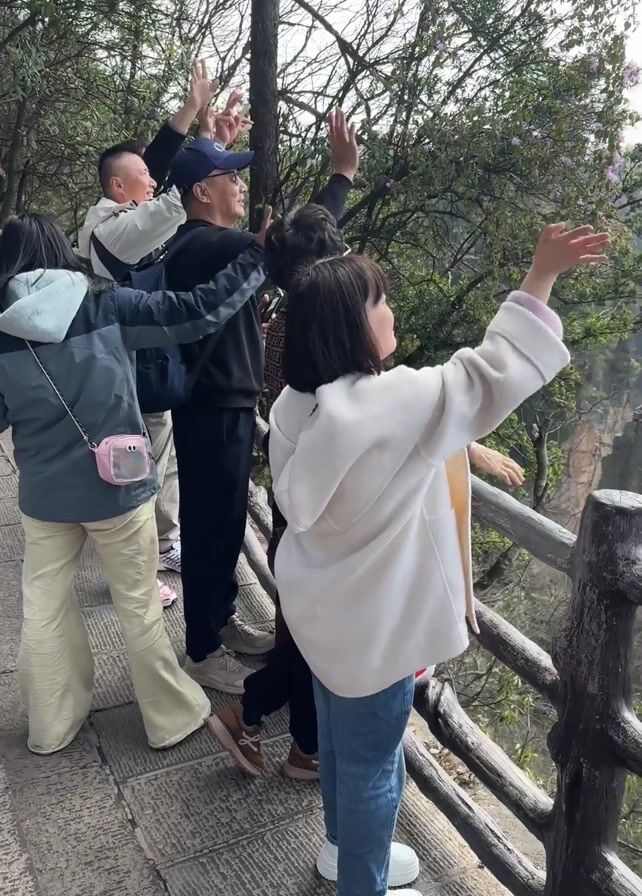 A group of people stands on a stone pathway next to a wooden railing, waving at a drone that is flying in the distance. Some of the people are holding up the peace sign. They appear to be looking at a view in the distance. The view is a landscape of mountains with trees. The people are dressed in casual clothing. One person is holding up a cell phone in a tripod.