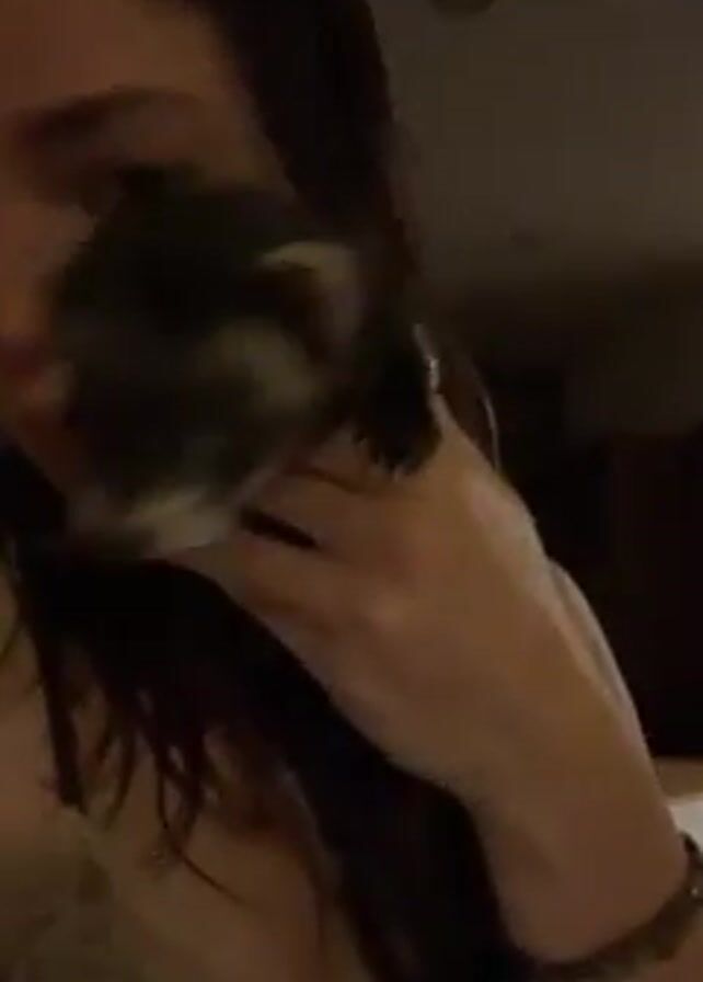 A young woman holds a ferret against her chest in a poorly lit room. The ferret has dark fur on its body and a lighter stripe on its face. The woman kisses the ferret and then seems to react to a smell, making a face. The background includes a door and some nondescript wall decor.