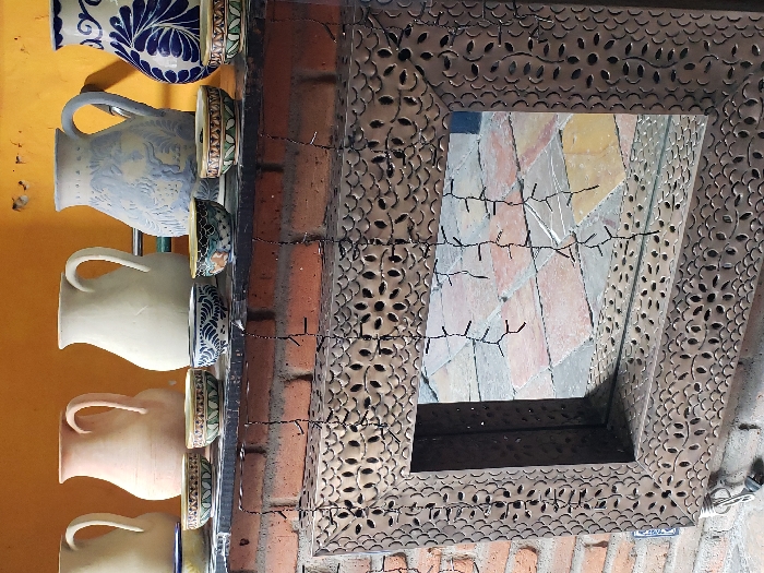 A collection of pitchers is displayed on a shelf beside a brick wall. The pitchers, arranged vertically, are various sizes and colors. A mirror hangs on the brick wall, its frame intricately designed with floral cutouts and adorned with delicate fairy lights. The mirror reflects the floor of a building with what looks to be diamond-shaped tiles.