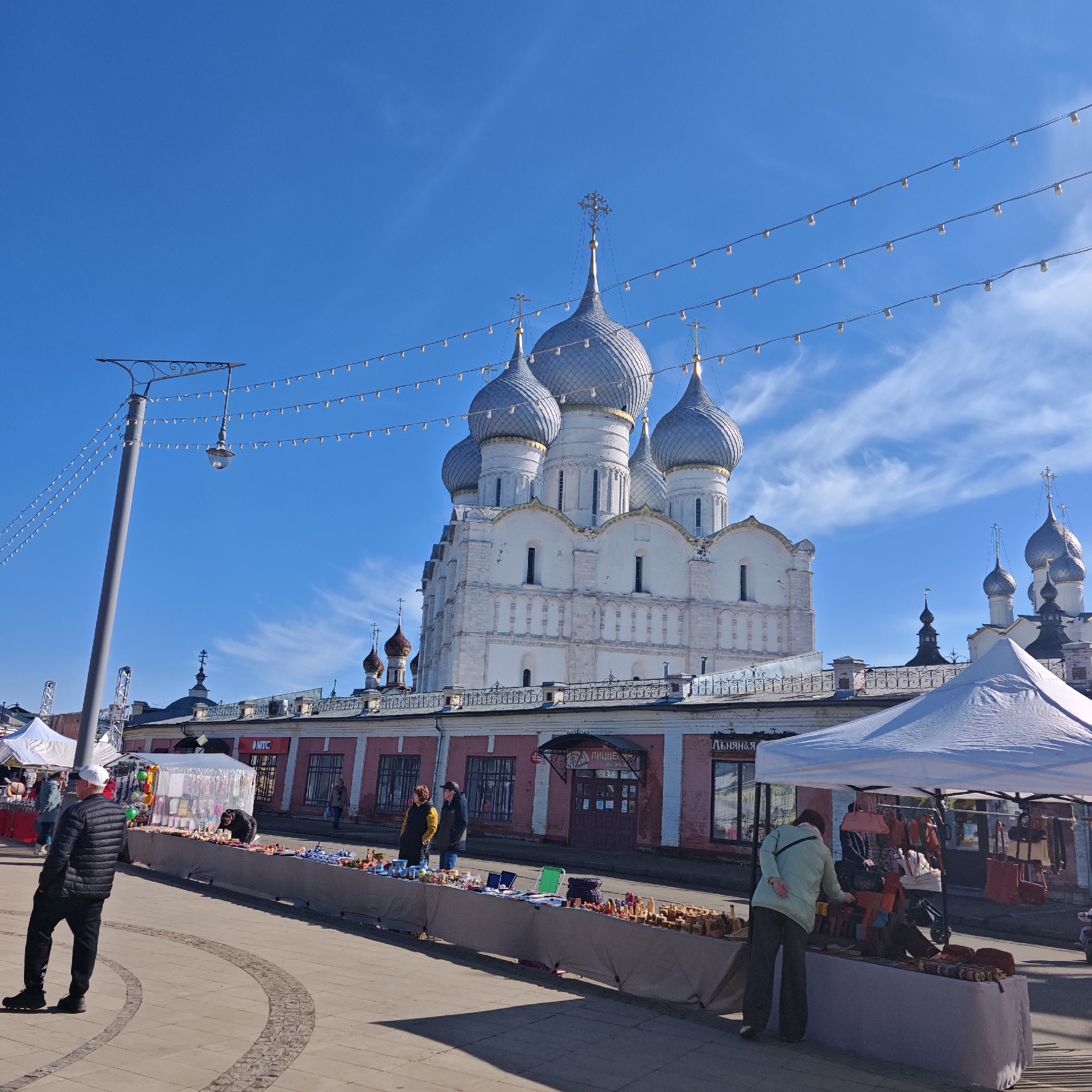 The image depicts an outdoor market scene under a clear blue sky in the city of Kladovitsy, Russia. In the background, a prominent white Russian Orthodox church with five large, grey, onion-shaped domes topped with golden Orthodox crosses stands against the sky. Smaller church domes are visible to the left and right of the main structure. Below the main church, a long, single-story building with a faded pink facade, white trim, and multiple windows houses businesses, indicated by partially visible signs such as "MTC" and "Льняная." A black wrought-iron railing runs along its roofline. In the foreground and mid-ground, a paved pedestrian area with circular patterns hosts numerous market stalls. Strings of decorative white lights are suspended horizontally across the upper portion of the scene, anchored by a tall, grey lamppost on the far left. Several individuals are present, engaging with the market. On the far left, a male in a black puffer jacket, black pants, and a white baseball cap stands with his back partially to the viewer, facing right towards the stalls. To the right, under a white tent, a female in a light green jacket and dark pants leans over a table, examining items. Another individual in a dark jacket is visible deeper within the same tent, also appearing to browse. Further along the market, a long table covered in grey fabric displays various items, including small wooden crafts, pottery, and other souvenirs. A green folding chair is visible behind this table. Two individuals, a female in a yellow jacket and a male in a black jacket and cap, stand behind one of these stalls, observing. Additional people are discernible walking or standing in the background near the pink building and other market tents. The bright sunlight casts distinct shadows, indicating a clear day.