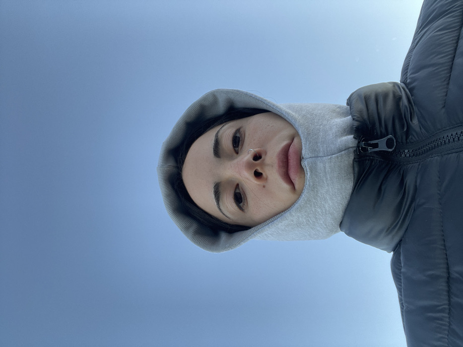 A low-angle, eye-level shot in Ushuaia, Argentina, shows one person from the chest up against a clear, solid blue sky. The individual, appearing to be female, looks directly into the camera with a neutral expression. She wears a light gray hooded garment, pulled tightly to expose only the face, under a dark-colored, possibly black, puffer jacket with a visible zipper closure. A silver-toned nose ring is present in her left nostril. Her dark hair is partially visible beneath the hood. The scene is brightly lit by natural light, suggesting daytime. No other objects or individuals are visible.