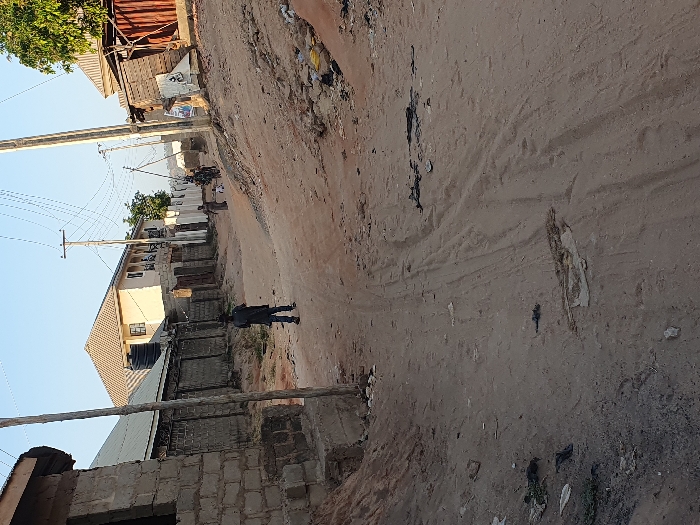 The scene depicts a residential street in Lokoja, Nigeria, under clear, bright conditions, likely early morning or late afternoon