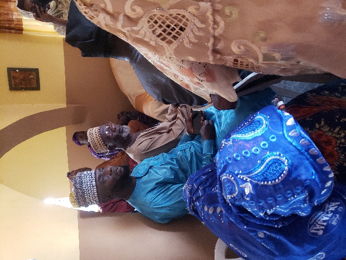 Several people are seated, likely indoors. An older man with a white beard and patterned cap is visible, alongside another man in a blue shirt and cap. A woman in a blue patterned head covering is in the foreground. Elaborate decorative fabric is draped above. A wall with a small framed picture hangs in the background. The scene seems culturally specific, potentially a religious gathering.