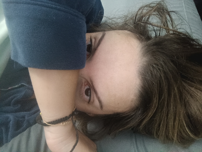 The image displays a close-up, horizontally oriented view of an individual, identified as being in Sagunto, Spain. The subject's head is positioned towards the right of the frame, resting on a light grey or bluish-grey textured fabric surface. Dark brown hair, appearing somewhat dishevelled, is spread across this surface. The individual's left arm is bent at the elbow, with the forearm positioned across the lower facial area, partially obscuring the nose and mouth. This arm is covered by a dark blue, long-sleeved garment, and its wrist is adorned with multiple dark, cord-like bracelets. Both of the subject's eyes are open and gaze directly into the camera. The overall lighting is diffuse and uniform.