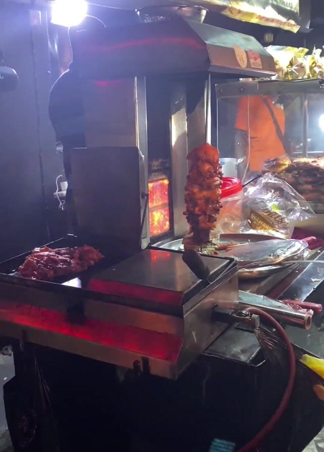 nighttime street scene, likely near a food stall. The stall has a variety of cooked meats on display, including a vertical spit of shawarma-like meat. A man in a sports jersey and a baseball cap is looking at his phone, standing in front of the food stall. Another man in a white t-shirt is standing next to him. There is activity inside the stall. People are walking by on the sidewalk. The lighting is a mix of bright fluorescent lights from the stall and streetlights, and the video is shot in a shaky manner.