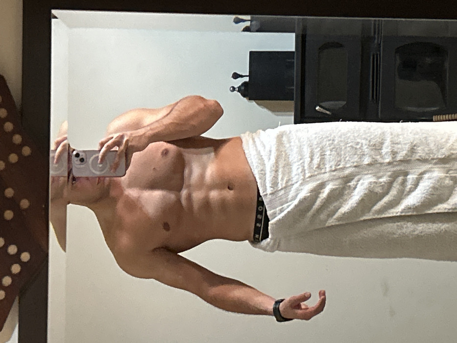 The image depicts a reflection of an adult male captured in a mirror within an indoor setting in the city of Sarouja Municipality, Syria. The individual is shirtless, showcasing a muscular torso with defined abdominal muscles and visible arms. He wears a white towel wrapped around his waist, with the waistband of black underwear, partially displaying text (likely "BOSS"), visible above the towel. A black smartwatch is present on his left wrist. The male's face is obscured by a light-colored smartphone, likely an iPhone due to its camera array and visible MagSafe ring, which he holds with his right hand to take the photograph. The mirror has a dark, possibly wooden, frame with a beveled edge. In the reflected background on the right, a dark, multi-compartment cabinet or dresser is visible, topped with two dark, decorative finial-like objects. The wall reflected in the mirror is a plain, light color. The top edge of the mirror reflects a patterned surface with light circular elements on a dark background.